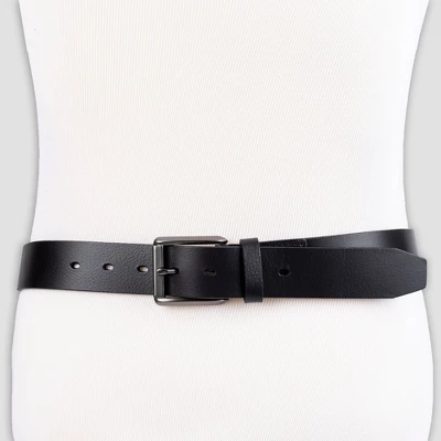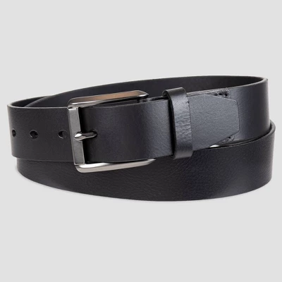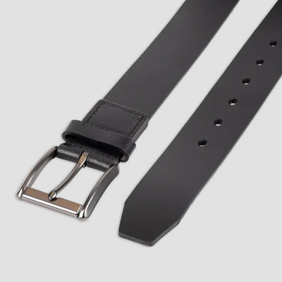 Complement your casual jeans with the chic look of this Black Leather Belt from Goodfellow & Co™. This leather belt makes a great addition to your styling accessories. It features a solid black finish for a versatile, sleek look. This men’s belt fastens with a square metal buckle to help ensure your pants stay in place and your shirt stays tucked in. Wear with jeans, trousers or dress pants for a stylish twist.